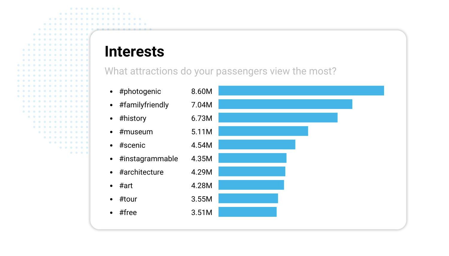 See what’s grabbing the attention of your passengers as they explore our destination guides with interest-based category tracking like family friendly, history, art, and more.